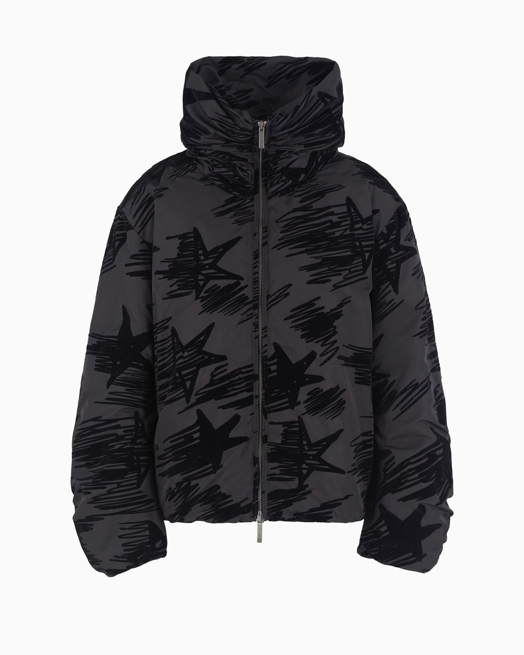 マットなナイロン地で仕立てた、パディング入りのフルジップジャケットです。独特の立体感とベルベットのような風合いを生み出すフロックプリントをあしらい、今シーズンを象徴するパターンである星を描き出しています。深みのあるダークトーンの地に、ラインストーンや煌めき感のあるディテールで月や星のモチーフを描き、ウェアに華やかな輝きのアクセントをつけた限定ムーン カプセルコレクションのアイテムです。マフラー代わりもなるスタンドカラーでネックが暖かいのもポイントです。