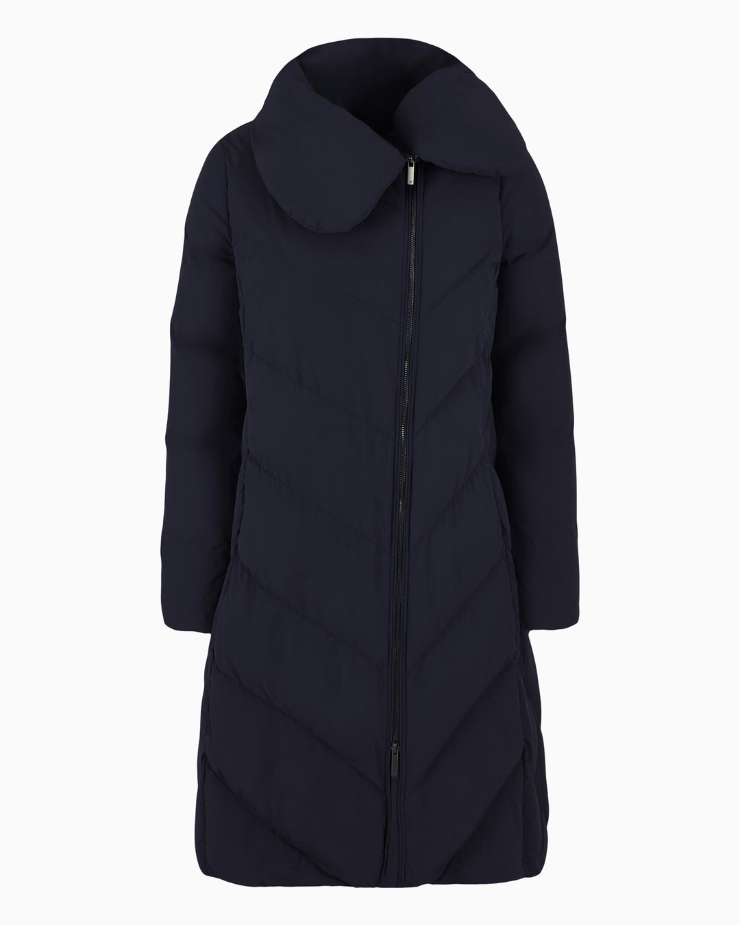 オフセンターの前あきにジップを配した、七分丈のダウンジャケットは、ストレッチナイロン生地に環境にやさしい100%サステナブルな再生素材のパディングを使用しています。全面に施されたキルティングがアクセントになっており、ファッション性の高いダウンです。スタンディングにしてマフラー代わりにもなるカラーは取り外しが可能です。また、表地はストレッチナイロンを使用し、実用的でモダンな雰囲気に仕上げています。撥水加工が施されていて、着心地のよさだけでなく、機能面も優れたアウターです。ブラックカラーはシーンを選ばずご着用頂けます。