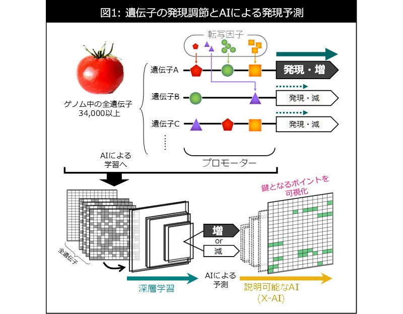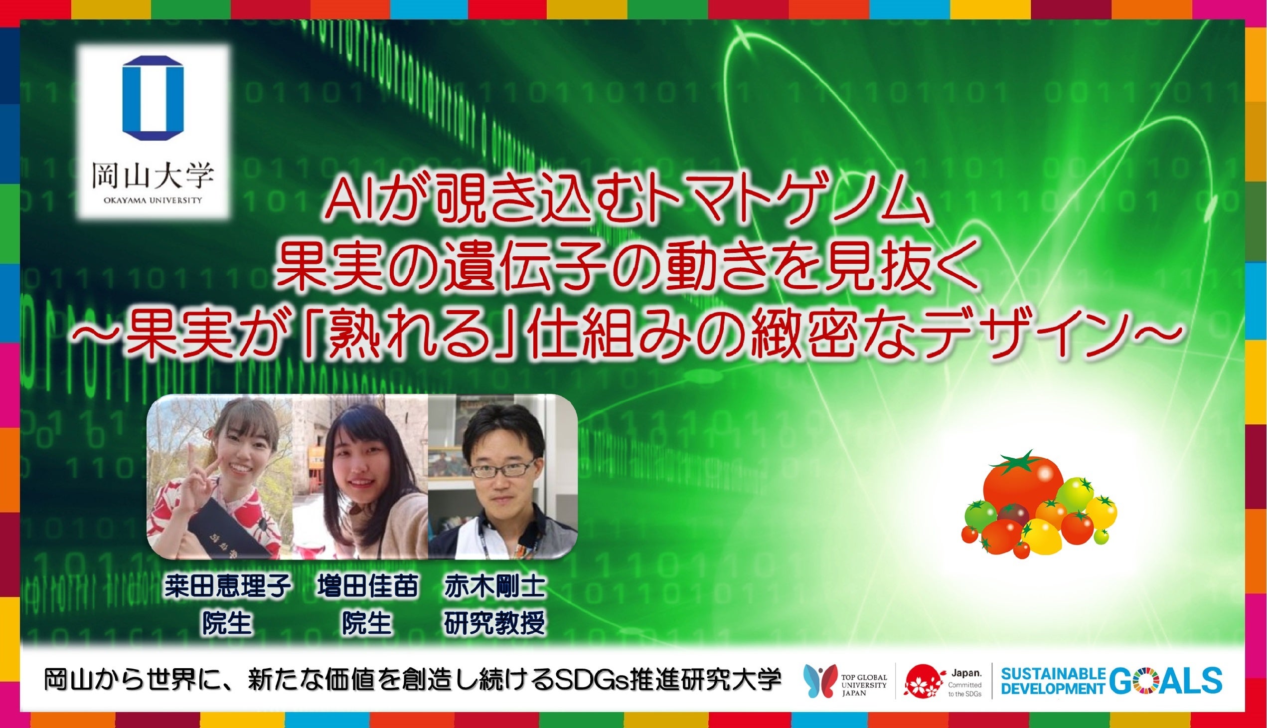 国立大学法人岡山大学(本部:岡山市北区、学長:槇野博史)学術研究院環境生命科学学域(農)の赤木剛士研究教授、増田佳苗院生 (D3)、桒田恵理子院生 (M1)は、このたび国立研究開発法人農業・食品産業技術総合研究機構、筑波大学大学院生命環境系、九州大学大学院システム情報科学研究院の共同研究者とともに、本来は写真などの画像・映像や言語に使われることが多いAI技術である深層学習(ディープラーニング)をトマトの全ゲノム情報に適用することで、果実が「熟れる」過程で重要となる遺伝子の発現変化を予測する技術を開発しました。