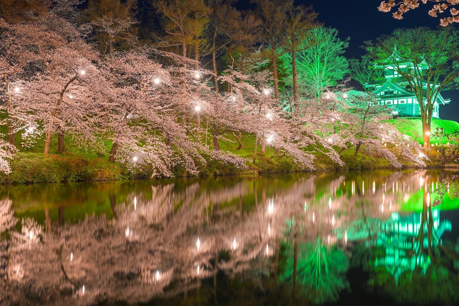 上野の恩賜公園、弘前城公園とともに、日本三大夜桜の一つに数えられる高田公園の桜。「高田城址公園観桜会」は、2025年で第100回を迎えます。公園周辺には約4,000本の桜があり、夜になるとぼんぼりに照らされ、美しい桜とライトアップされた高田城三重櫓が堀の水面に映るさまが幻想的で人々に感動をもたらせてくれます。
