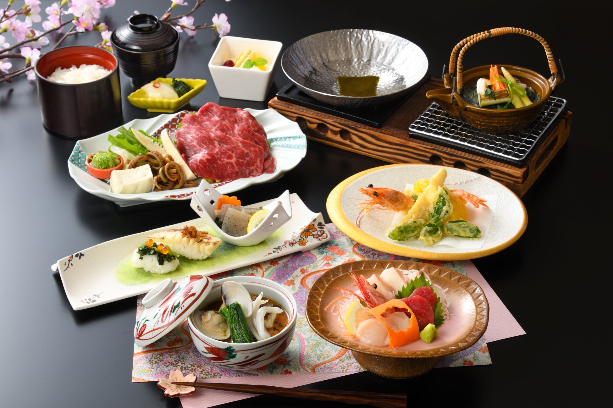 夜桜ツアーバスとホテルの宿泊がセットになったプランです。ご夕食は、春鯛や蛤などの春らしい食材や、春ならではの山菜が登場する「奏(かなで)会席」をご用意します。