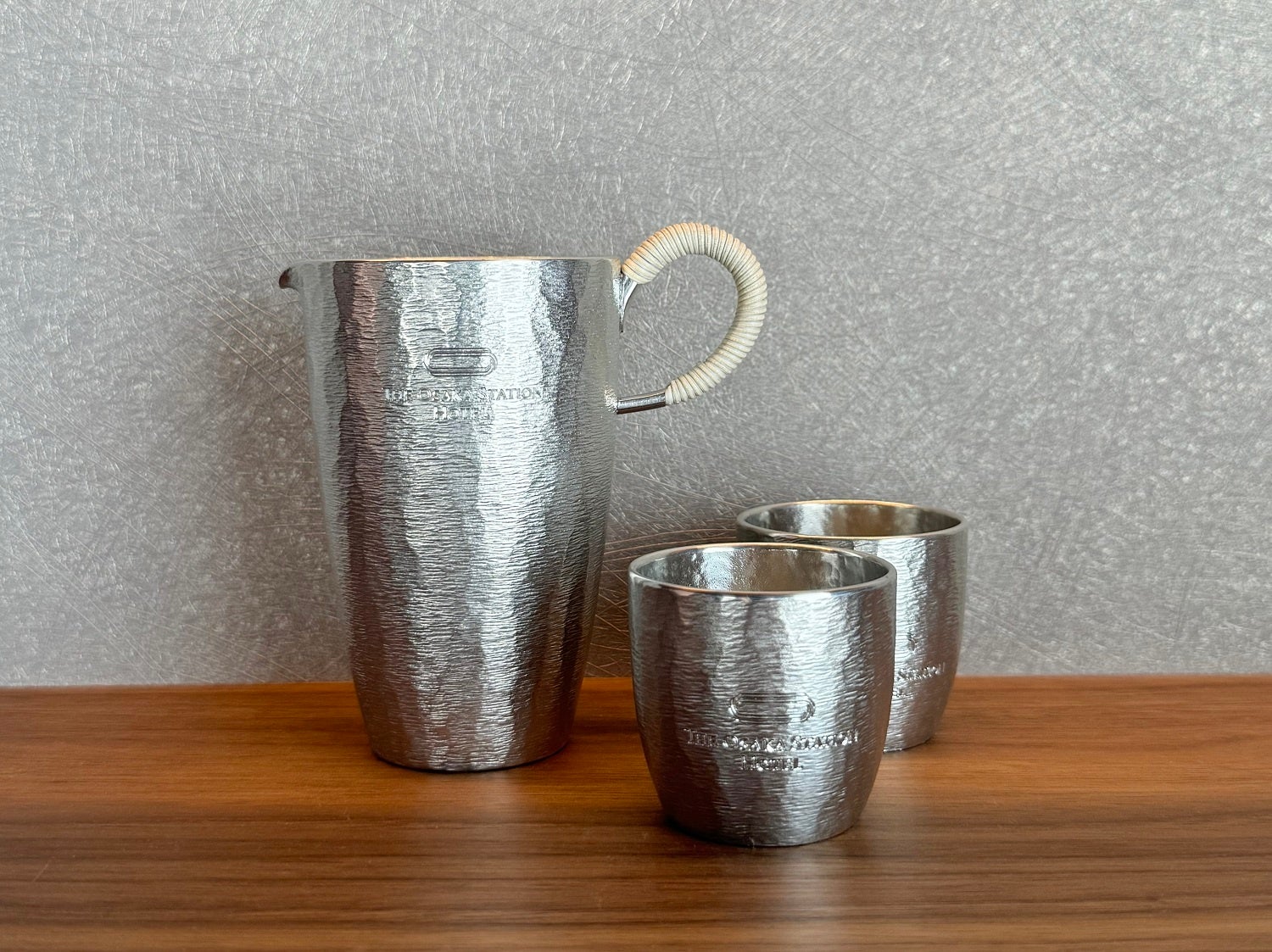 非日常へといざなう錫の繊細な輝きと、燗も冷酒も楽しめる優れた熱伝導性や、丁寧な磨きの技によるやさしい口当たりをご堪能いただけます。また、錫の器でお酒を飲むと、よりまろやかに感じられ製のると言われています。大阪錫器株式会社製の「大阪ステーションホテル」ロゴ入りの限定品です。