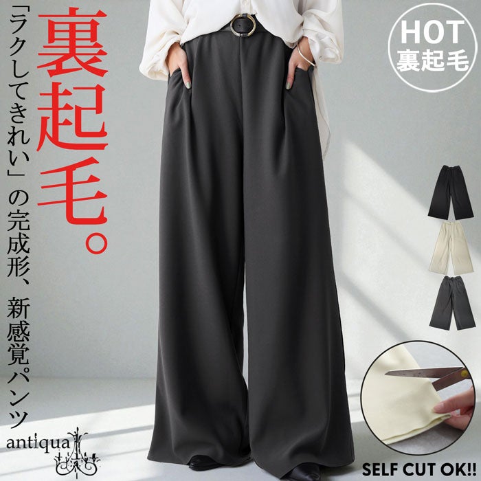 裏起毛素材のあたたかさと、ジョーゼットの落ち感を兼ね備えたワイドパンツです。伸縮性があるため動きやすく、長時間の着用にも適している点が特徴。セルフカット仕様で、自分に合った丈に調整できる機能も備えており、さまざまな体型やスタイリングに対応しやすい一本となっています。
