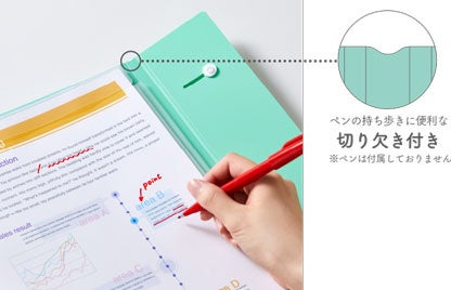 上下についたフラップで書類を挟む形状のため、書類を収納したまま文字などを書き込むことができます。 また、ペンの持ち歩きに便利な切り欠きも付いています。