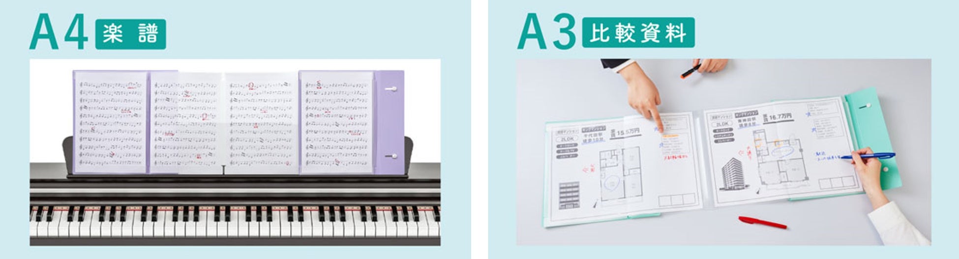 ファイルの表と裏に付いているスナップボタンをどちらも外すことで、ジャバラ式に展開できます。A4 サイズの 書類を 4 枚同時に閲覧できるので、譜面台に置いた際に書類の一覧性が高く、ページをめくる手間を減らすこと ができます。A3 サイズの書類も2 枚横並びで収納できるため、楽譜の収納だけではなく、資料を比較したい時にも便利です。