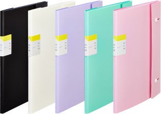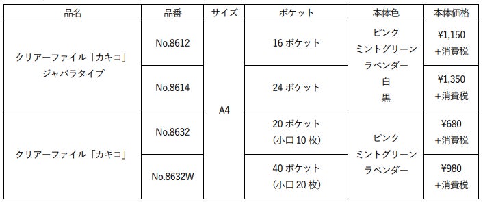 そこで今回、楽譜の収納に最適なクリアーファイル「カキコ」ジャバラタイプを発売します。書類を入れたま ま書き込める特長はそのままに、A4 サイズの書類を4 枚同時に閲覧することが可能なので、譜面台に置いた際 に一覧性が高く、ページをめくる手間を減らすことができます。A3 サイズの書類も2 枚横並びで収納できるた め、楽譜の収納だけではなく資料を比較したい時にも便利です。 ラインアップは16 ポケットと24 ポケットの2 種類で、カラーはそれぞれピンク、ミントグリーン、ラベンダ ー、白、黒の5 色展開です。また、従来のクリアーファイル「カキコ」もピンク、ミントグリーン、ラベンダー の3 色を新たに追加します。