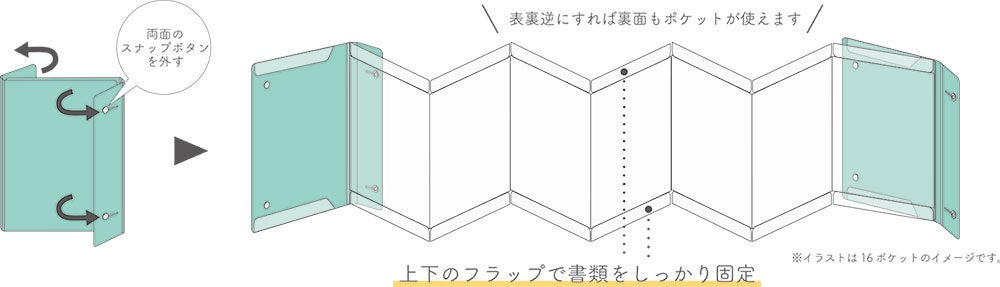 スナップボタンを片方だけ外すと、通常のクリアーファイルのように書類をパラパラとめくって閲覧できます。ファイルの表と裏を逆にすれば、裏面のポケットも同様に使用できます。