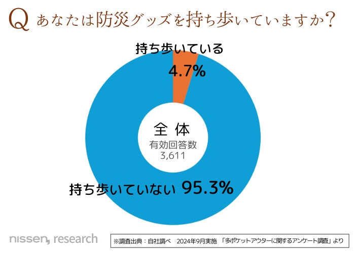 外出時に”防災グッズを持ち歩いている”のは、わずか5%未満。ほとんどが持ち歩いてはおらず、自宅で防災グッズを常備している層も、持ち歩いてはいない結果となりました。