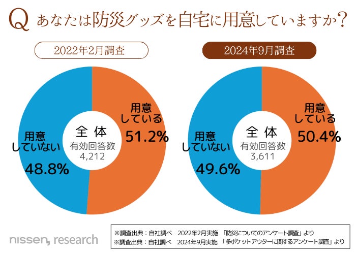 防災グッズを自宅に用意している割合は、約半数。2年前の調査とほぼ変化がなく、防災への備えが高まっているとは言えない結果となりました。