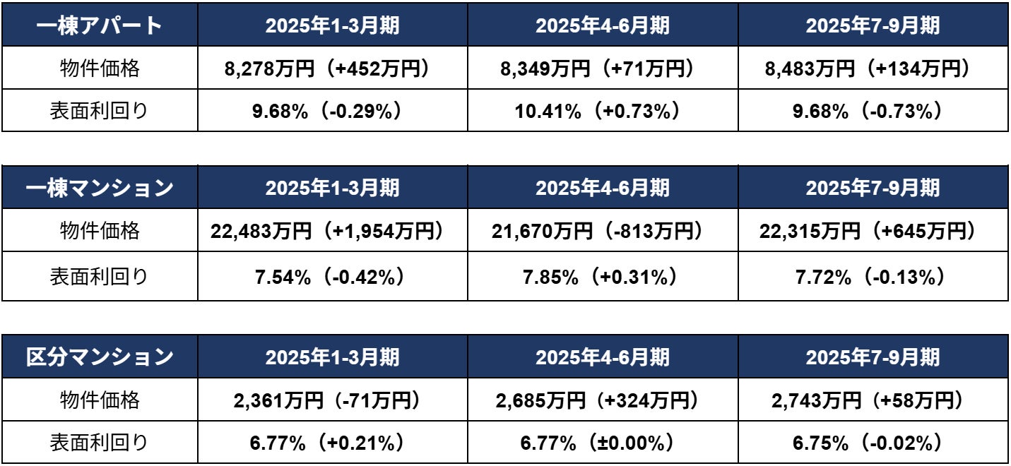 前四半期(2025年4-6月期)に続き、一棟アパート・区分マンションともに過去最高額を更新しました。一棟マンションにおいても、2025年1-3月期に記録した過去最高額2億2483万円に迫る、2億2315万円まで上昇しています。