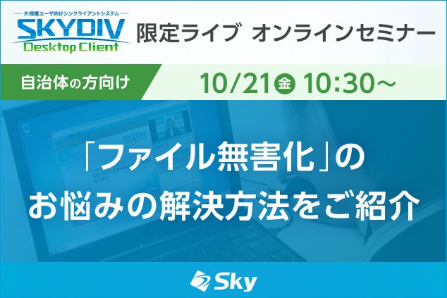 【10/21開催】自治体の方向け:「ファイル無害化」のお悩みの解決方法についてご紹介するオンラインセミナーを開催いたします<SKYDIV Desktop Client>