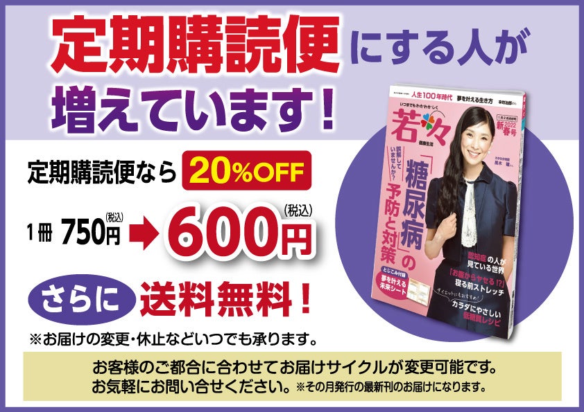 『若々』新春号では、「イキイキ寿命を延ばそう」をテーマに、「目」「脳」「体」「美」それぞれの側面から、生活に役立つ情報をお届け。今回は、とくに「糖尿病」でお悩みの方や「糖尿病」について深く知りたい方は必見。皆さまが「若々しく健康的な生活」を実現するためのお手伝いをいたします。