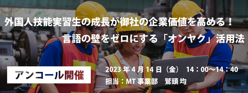 高精度AI自動翻訳の開発・運営を行う株式会社ロゼッタ(本社:東京都千代田区 代表取締役:渡邊 麻呂)は、無料ウェビナー『外国人技能実習生の成長が御社の企業価値を高める! 言語の壁をゼロにする「オンヤク」活用法』を2023年4月14日(金)に開催いたします。