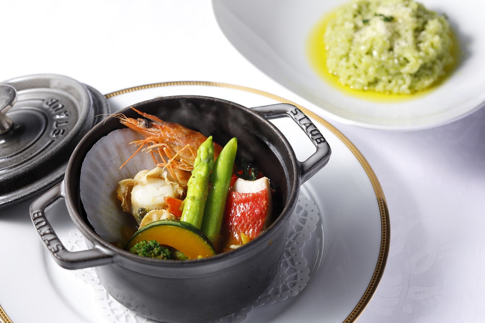 - 北海道 函館産 殻付き帆立貝のアクアパッツァ風スープカレーと八女茶のリゾット 3,300円