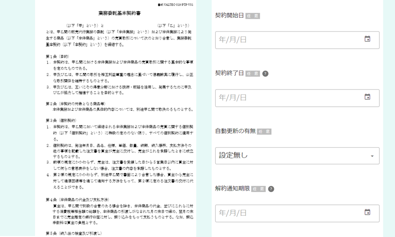 契約書だけでなく、同意書、申込書、注文書などの文書も管理できます。契約締結日、開始日、自動更新の有無などを設定。過去の契約締結状況をすぐに検索できます。