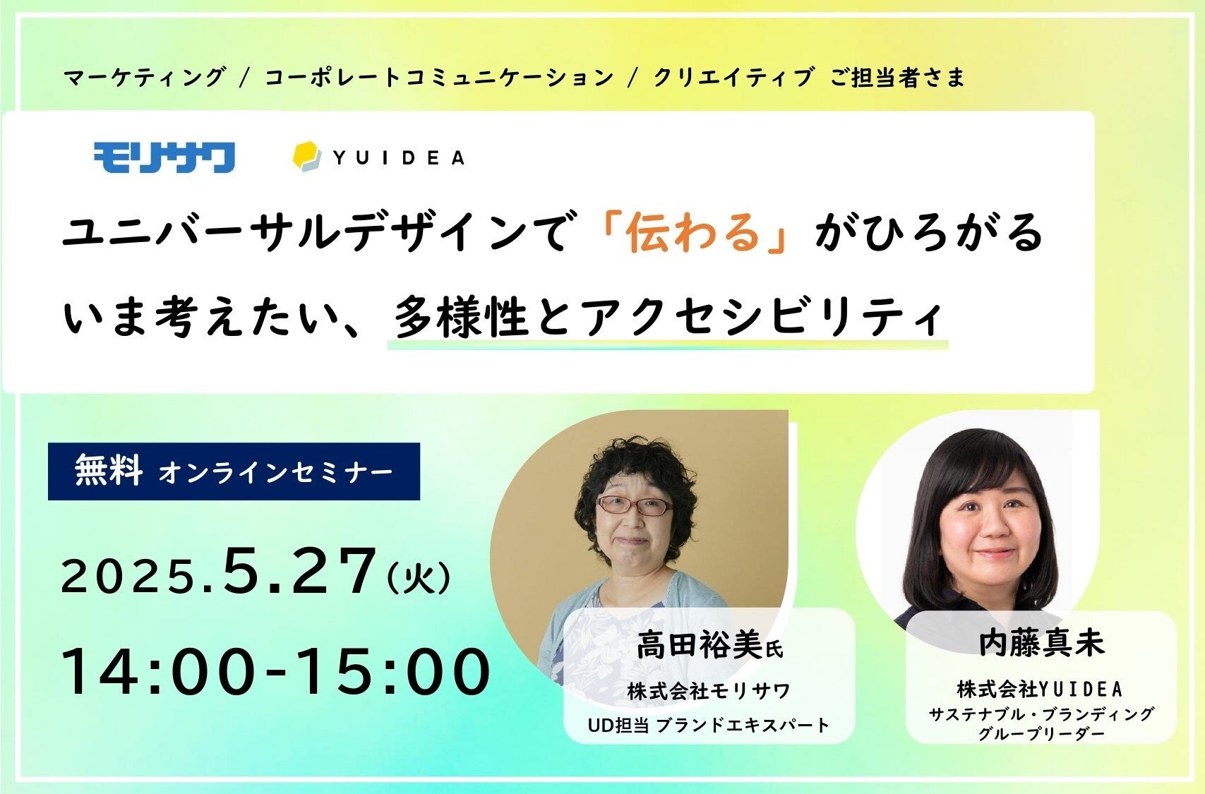 株式会社モリサワ(以下モリサワ)は、株式会社YUIDEA(代表取締役社長:細矢和宏、以下YUIDEA)と共同で無料オンラインセミナー〈ユニバーサルデザインで「伝わる」がひろがる いま考えたい、多様性とアクセシビリティ〉を2025年5月27日(火)に開催します。