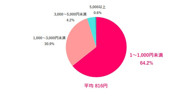 Q.1で「職場の人」に渡す予定と回答した人に、チョコの購入予算を尋ねたところ、「1~1,000円未満」が最も多く64.2%、次いで「1,000~3,000円未満」30.9%でした。1人当たりに購入するチョコの平均金額は816円で、「恋人・配偶者」の2,762円と比較すると1/3以下となっています。