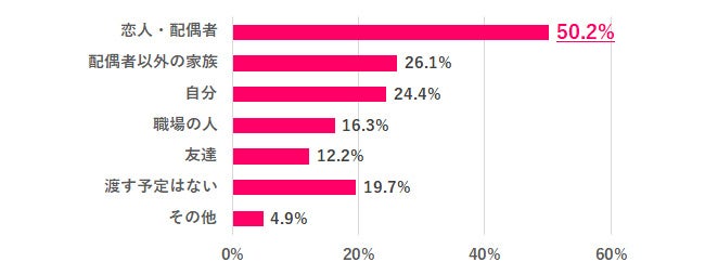 『女の転職type』会員に今年のバレンタインは誰かにチョコを渡す予定があるかどうか尋ねたところ、「渡す予定はない」人が19.7%で、80.3%の人が渡す予定があることがわかりました。渡す相手1位は「恋人・配偶者」50.2%、2位「配偶者以外の家族」26.1%、3位「自分」24.4%となっています。