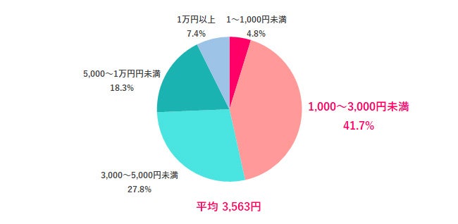 Q.1で「自分」に渡す予定と回答した人に、チョコの購入予算を尋ねたところ、「1,000~3,000円未満」が最も多く41.7%、次いで「3,000~5,000円未満」27.8%でした。平均金額は3,563円で、「恋人・配偶者」の2,762円、「職場」の816円と比較すると最も高い金額となっており、「1万円以上」と回答する人も7.4%いました。