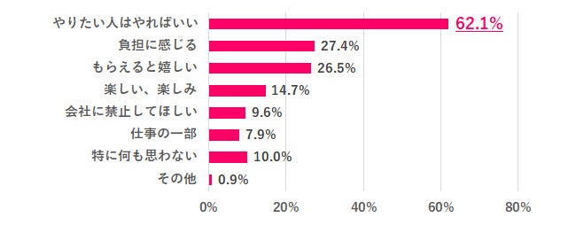 職場でバレンタインにチョコを渡す習慣についてどう思うか尋ねたところ、「やりたい人はやればいい」が最も多く62.1%でした。次いで、「負担に感じる」27.4%、「もらえると嬉しい」26.5%、「楽しい、楽しみ」14.7%、「会社に禁止してほしい」9.6%となっており、ポジティブ派とネガティブ派が混在している様子が見て取れます。