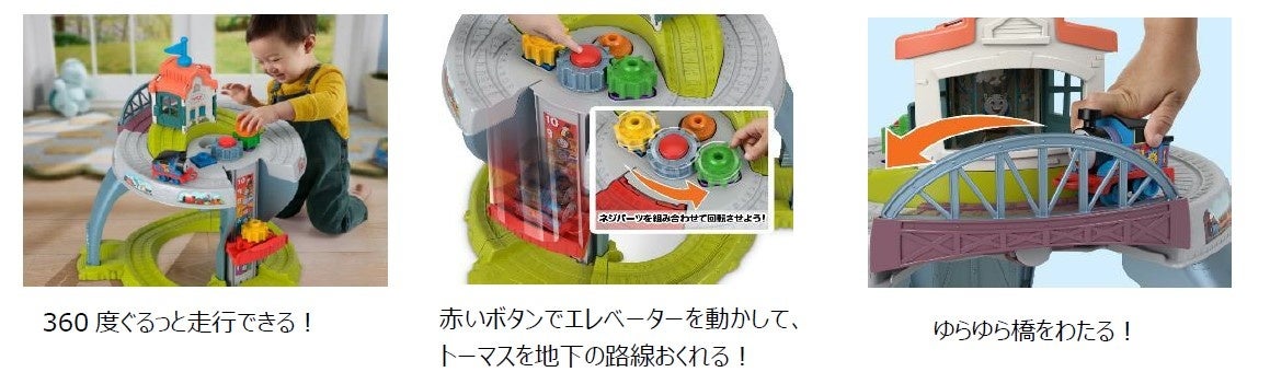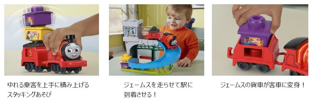 【Point】 ✓ トーマスに最初に出会うお子さまのための「マイファーストトーマス」シリーズは ゆびあそびができるしかけがいっぱい。はじめての知育おもちゃにもプレゼントしたい新シリーズ。 ✓ 機関車は2つのスタッキングおもちゃがゆらゆら揺れるたのしいアクションつき! 小さな手でもつなぎやすい!つなげたりはずしたり知育あそびができる! ✓ 「時間だよ!ジェームスとナップフォードステーション」は楽しいゆび遊びのしかけがたくさん。 カーゴピースが付属していてすぐに遊べる充実のプレイセット! ✓ 「きかんしゃトーマスを走らせよう!2層の線路テーブル」は、機関車トーマスが360度ぐるりと 円を描いた線路の上を進む!上下に動くエレベータ付きの2つの線路などのしかけで、 楽しい発見がいっぱい。 |
