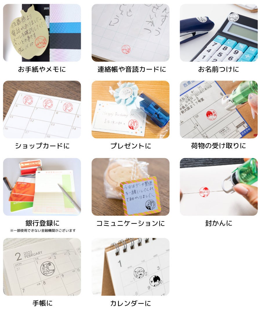 荷物の受け取りやメモなどへのサイン替わり、持ちものへのお名前つけ、お子さまの連絡帳や音読カードなどにポンポン押せるセルフインクタイプ、全国ほとんどの金融機関にも登録できる木彫りタイプ、黒水牛タイプから選べます。
