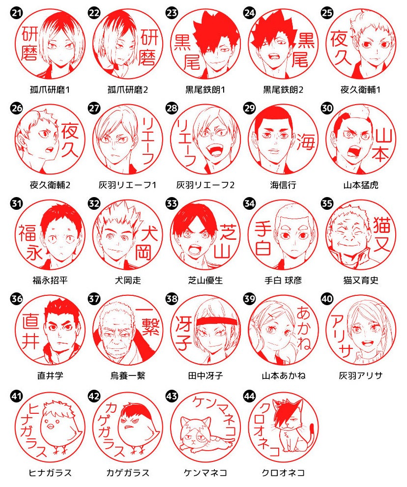 作品の中で最も人気のあるストーリーの一つ、烏野高校VS音駒高校、通称“ゴミ捨て場の決戦”。選べるキャラクターは44種類。荷物の受け取りやサインがわり、お名前つけ、お子さまの連絡帳や銀行登録にも使えます