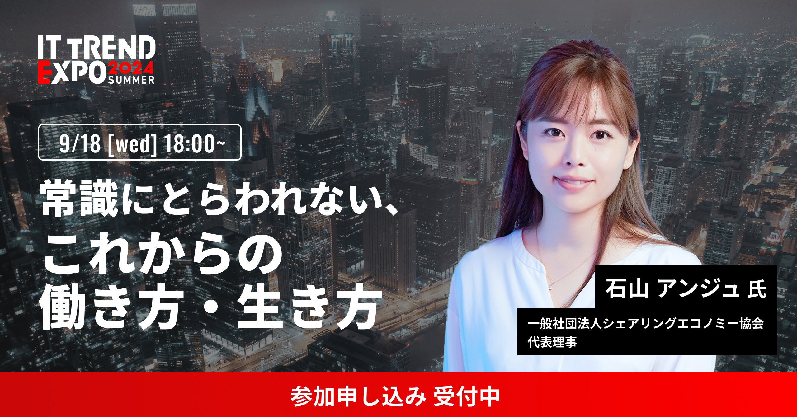 業界最大級のオンライン展示会「ITトレンドEXPO2024 Summer」、一般社団法人シェアリングエコノミー協会 代表理事 石山 アンジュ氏の講演内容が決定!