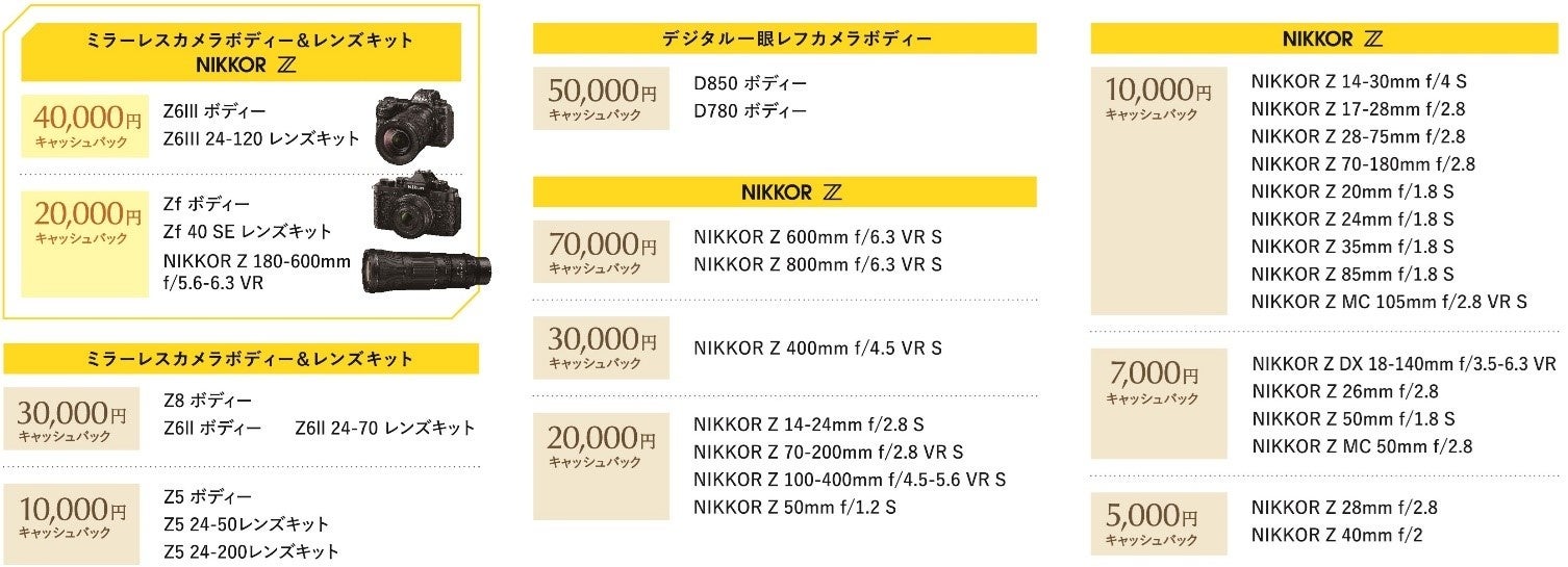 内 容:キャンペーン期間中に対象製品を購入し、ニコンイメージング会員の登録ならびに製品登録※1のうえ、所定の応募用紙に必要書類を揃えて応募された方全員にキャッシュバック※2いたします。