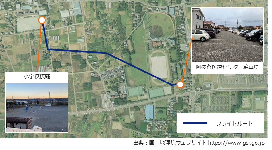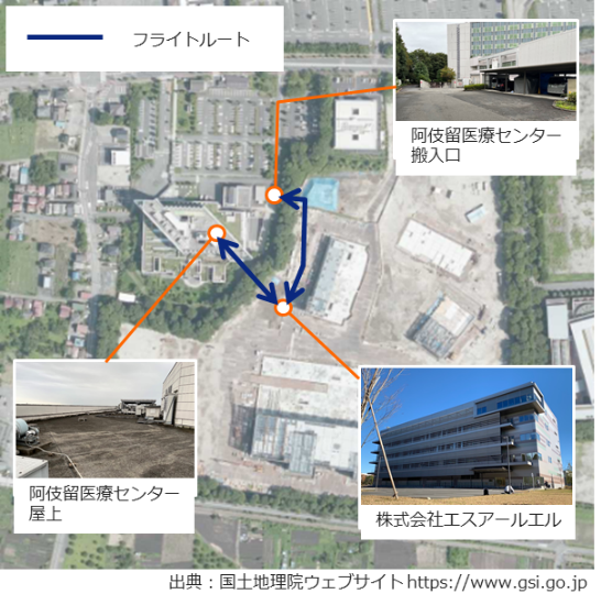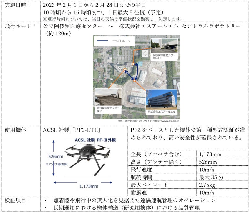 レベル4飛行でのドローン運用を想定し、2023年2月の平日日中帯に、遠隔地からの運航管理による飛行業務を行います。公立阿伎留(あきる)医療センター(所在地:東京都あきる野市引田78番地1)と株式会社エスアールエル セントラルラボラトリー(所在地:東京都あきる野市渕上50)の間で飛行ルートを設定し、物流用ドローンの自律飛行による医療物資輸送を行います。