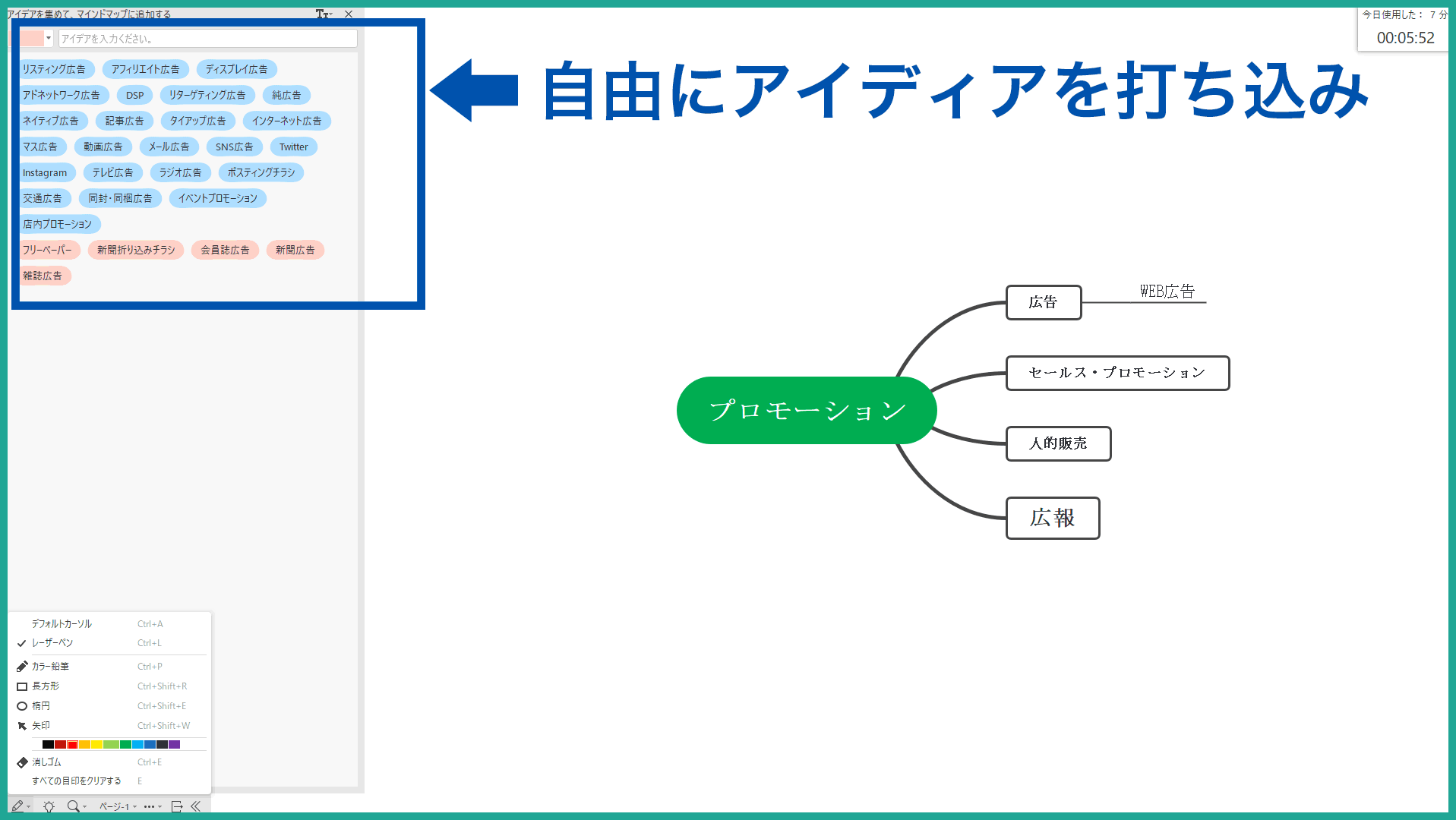 使い方は簡単。【左側エリア】に「アイディア」や「内容」を自由に打ち込み【右側エリア】にドラッグ・アンド・ドロップ。手書きもOKです!ホワイトボードの様に書き出した内容が「見える化」されていきます。