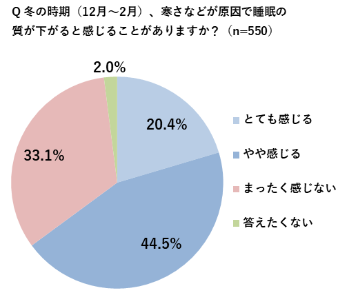 「冬の時期(12月~2月)、寒さなどが原因で睡眠の質が下がると感じることがありますか?」という質問では、約65%の人が「寒さなどが原因で睡眠の質が下がると感じる」ことが判明しました。