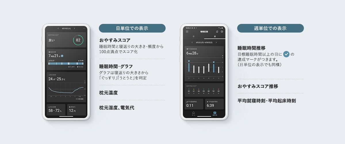 専用アプリがあなたの眠りを見守り、「おやすみスコア」を算出。睡眠時間や眠りの深さも見える化してくれるので、睡眠の習慣の改善に役立てることができます。また、毎日起きた後に行う暑い・寒いの体感のフィードバックをエアコンが学習し、その日の夜からあなた好みの睡眠環境にアップデートしてくれます。
