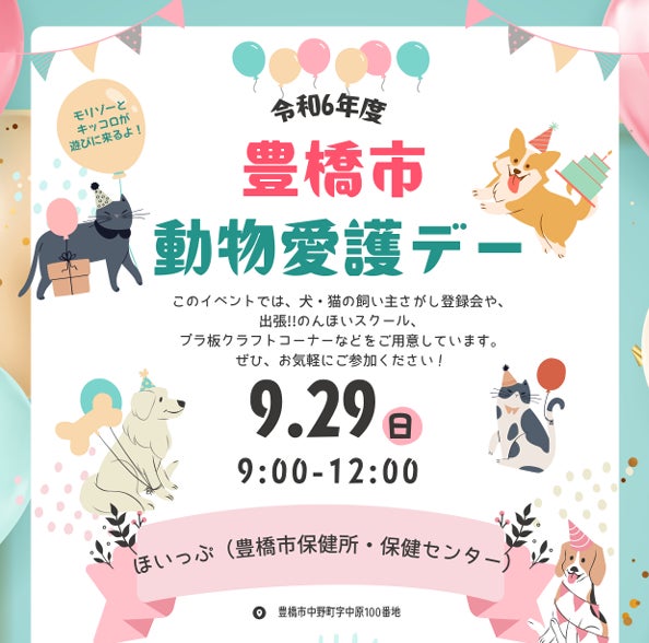 動物を⼤切にする気持ちを育む企画が盛りだくさんのイベント「豊橋市動物愛護デー」が2024年9⽉29⽇(⽇)、愛知県にある豊橋市保健所・保健センター(ほいっぷ)で開かれます。のんほいパーク(豊橋総合動植物公園)の職員による講演や保護した⽝・猫の飼い主さがし登録会など、動物の愛護と適正な飼養について関心と理解を深めるための催しのほか、⼦どもも楽しめるワークショップ、愛知万博(愛・地球博)の公式キャラクター、モリゾーとキッコロもイベントを盛り上げます!