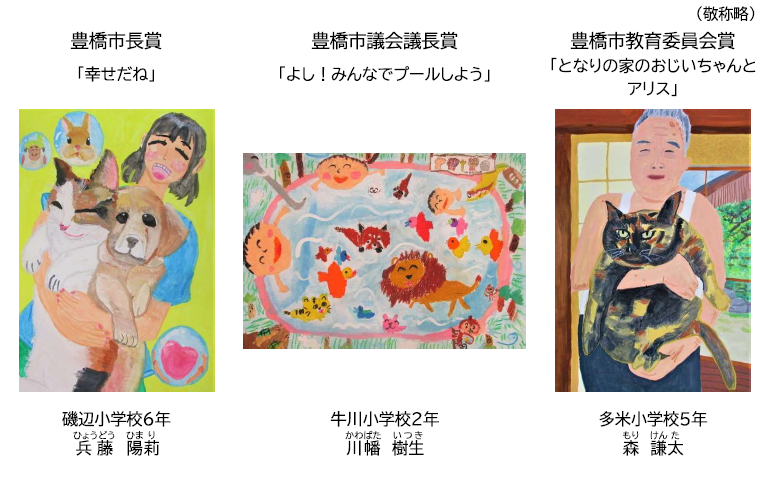 「動物愛護図画展」として、市内⼩学校40校から486点の応募があった愛らしい動物たちの絵の中から、⼊賞作品24点を展⽰します。期間は9⽉30⽇(⽉)まで豊橋市保健所・保健センター、10⽉2⽇(⽔)から9⽇(⽔)まで豊橋市中央図書館です。