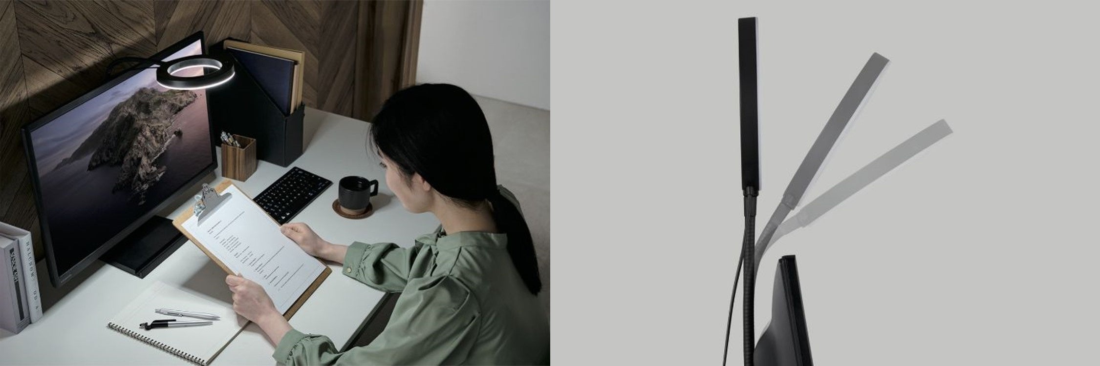 フレキシブルアームのため、ライトの角度・位置の微調整が可能で、手前に折り曲げることでデスクライトとしてもお使いいただけます。手元も明るく照らせます。使用しないときはモニターの裏にライトを収納できるため、お部屋をスッキリ見せることが可能です。