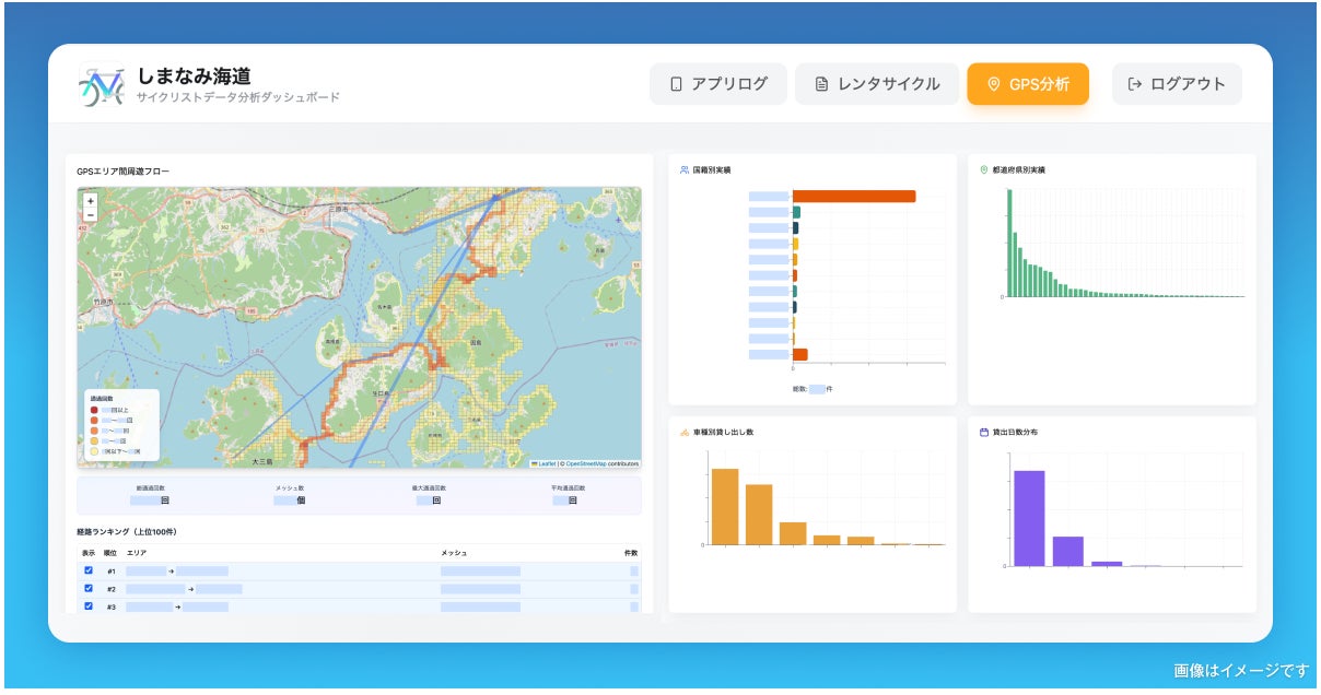 今回新たに導入する「分析用ダッシュボード」は、しまなみジャパンのレンタル予約ツールから取得される貸出件数や日数などの貸出実績と、ナビタイムジャパンの自転車専用ナビゲーションアプリ『自転車NAVITIME』にて、しまなみ海道エリアを利用した方から取得されるGPS等のデータを、一つのツールで閲覧できるものです。専門的な分析スキルがなくても直感的に状況を把握できるWebサービスで、簡単にデータ分析や施策検討に活用できます。