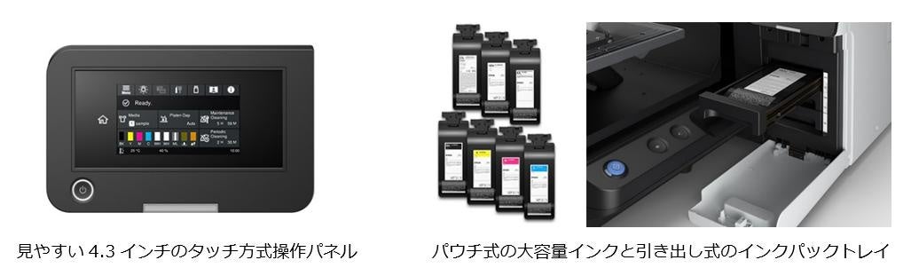 また、本体設計を全面的に見直し、従来機より奥行を約10cm短くして設置面積を縮小。冷却ファンがない設計のため稼働音が小さく、壁近くでの設置も可能になりました。天面での作業が可能なフラットな本体デザインや、見やすい4.3インチタッチ方式の操作パネル、便利な機内照明を採用し、さらに使いやすくなりました。インクシステムをインクカートリッジ式からパウチ式の大容量800mlインクパックに変更することでインク交換の頻度を低減し、作業効率も向上します。