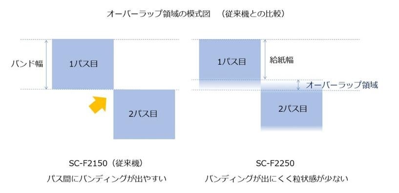 1.33インチの新プリントヘッド「PrecisionCoreマイクロTFPプリントヘッド」を採用。ノズル数が従来機の2,880から3,200に増えたことにより印刷速度が約25%向上しました。また、プラテン送りを改良し、オーバーラップ領域を持たせることでバンディングや粒状感を低減させ、画質も向上しました。