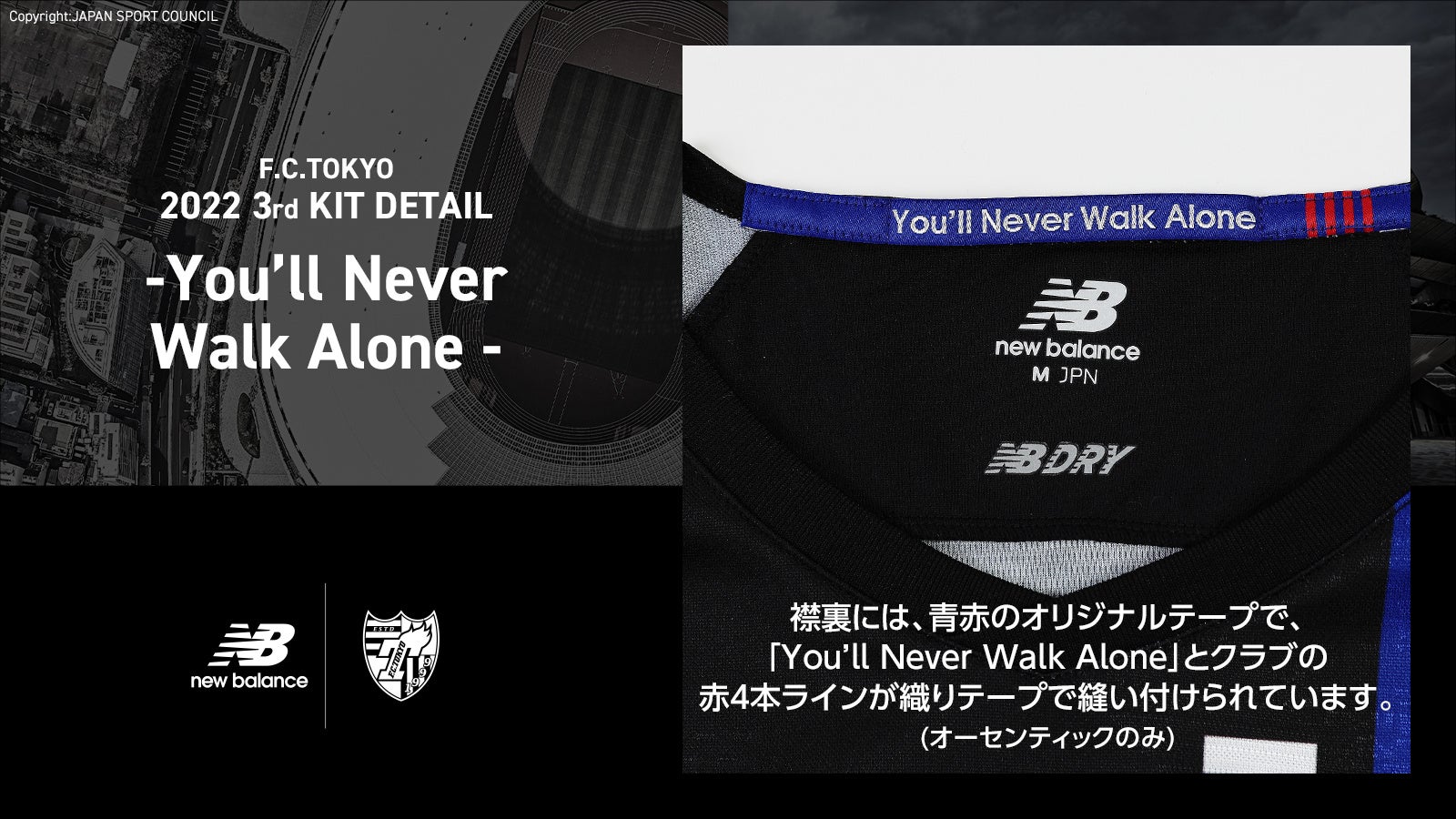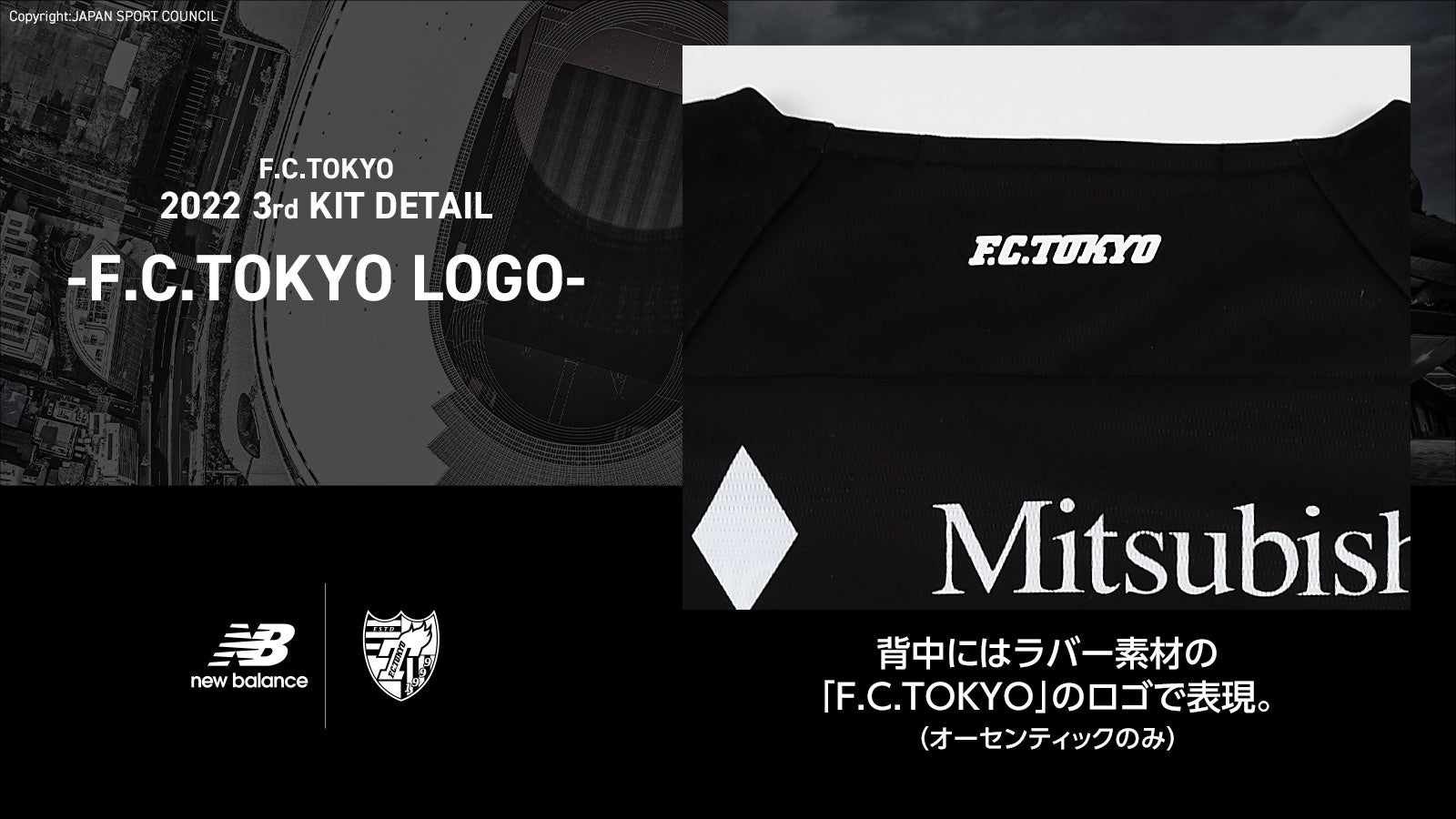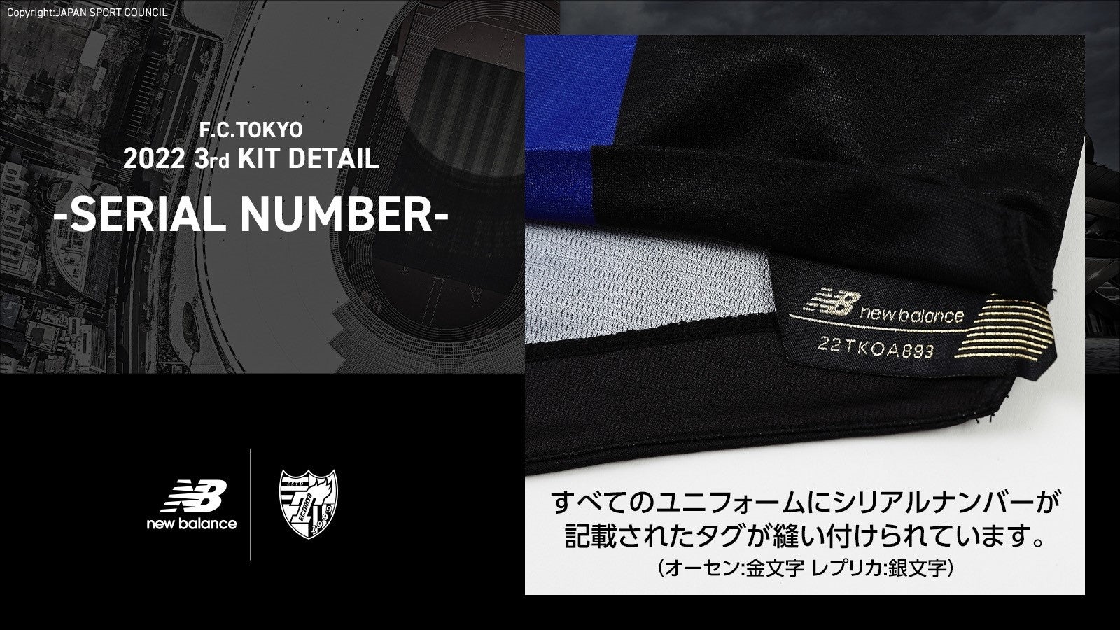 また今回は、国立競技場での着用を記念し、「JAPAN NATIONAL STADIUM」の文字と国立競技場をクラブカラーである青赤のグラデーションで表現。国立競技場は首都東京にあり、そしてその地でファン・サポーターとクラブが共に歩んできた歴史、大切な想いを「This is TOKYO」の文字に込めて、この特別な国立デザインを3rdユニフォームにデザインしました。