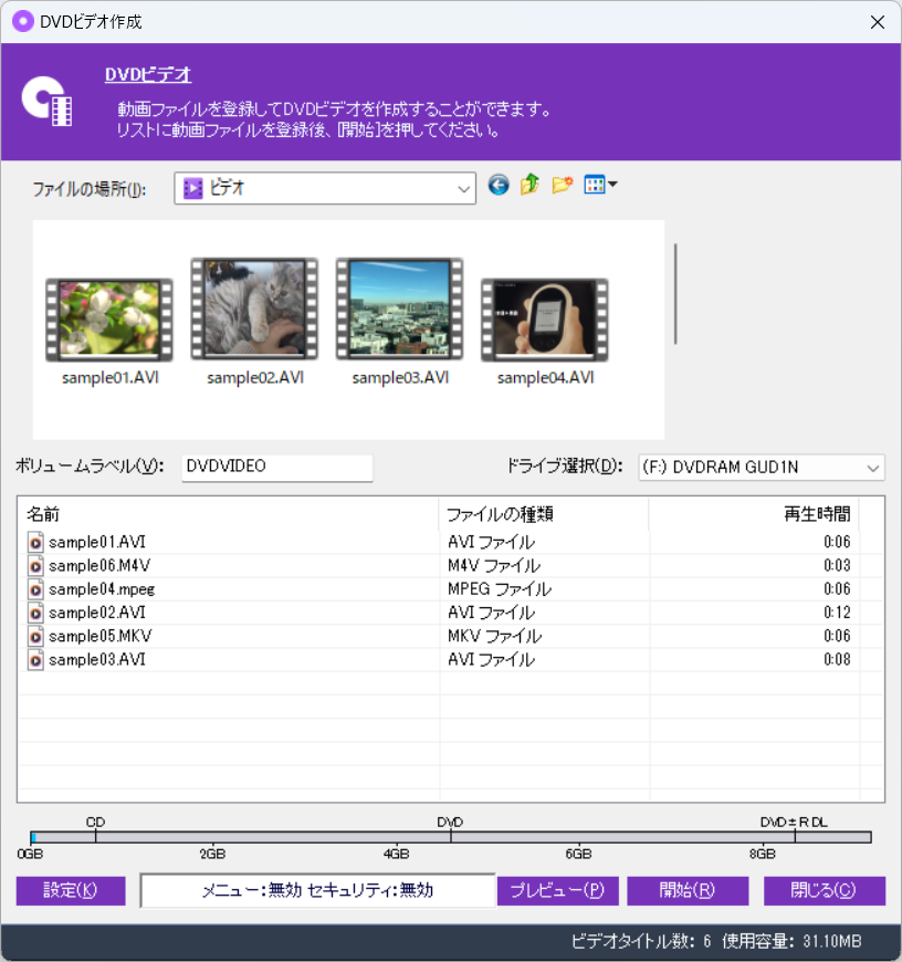 ・DVDメニュー名:変更不可(ファイル名が使用されます)