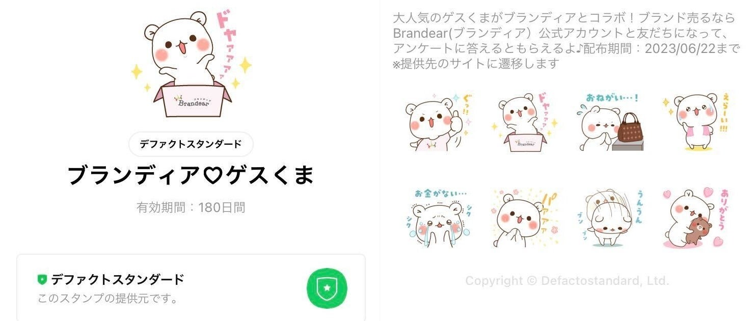 累計利用者数400万人突破を記念キャンペーン第一弾として、「ゲスくま」LINEスタンプを3月31日より先行配布しております。ブランディアのLINE公式アカウントに友だち追加後、アンケートへの回答でLINEスタンプがダウンロード可能です。