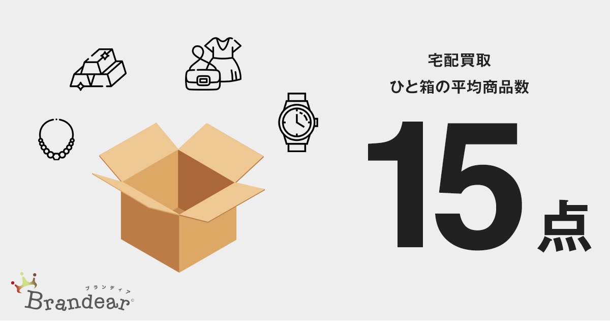ブランディアの原点である宅配買取は、不要なブランド品を段ボール詰めて送るだけの便利なサービスです。ハイブランドからカジュアルブランド、アウトドアブランド等、数千のブランド(※2)の買取を実現しています。段ボールひと箱あたりの平均商品点数は15点。一気に簡単に買取サービスを利用したいお客様にご活用いただいています。