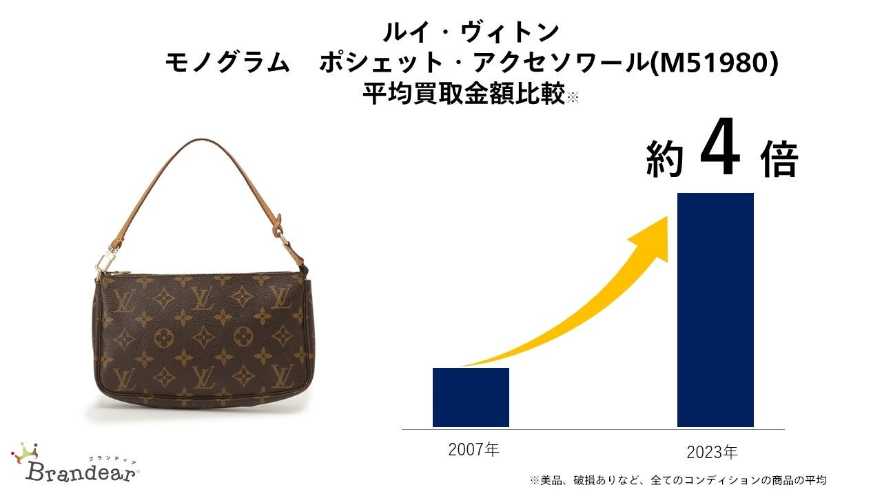 ブランディアが得意とするルイ・ヴィトンの買取においてもその傾向が見られます。例えば、ここ数年のミニバッグの人気もあり、ルイ・ヴィトン「アクセソワール」は、2007年から現在までに、平均買取金額(※1)が4倍に伸長しています。