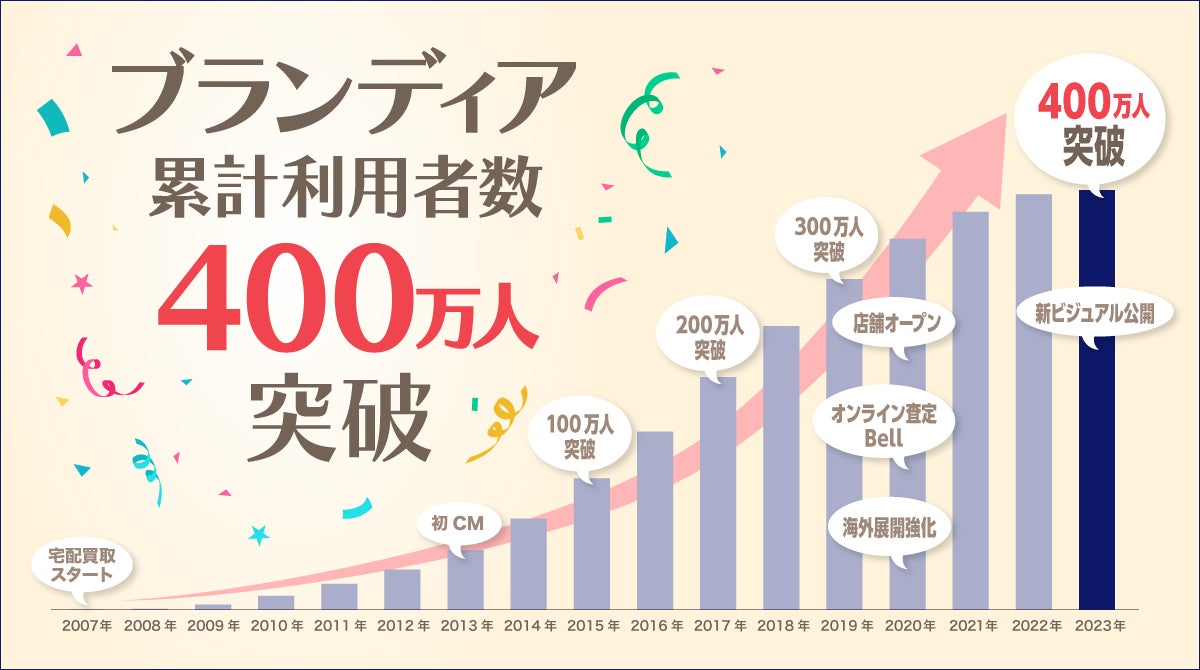 プレラブド(Preloved=大切に使用された)なアイテムをサスティナブルな循環につなげる国内最大級のブランド買取・販売サービス「ブランディア」は、買取サービスの累計利用者数が400万人を突破したことをお知らせいたします。