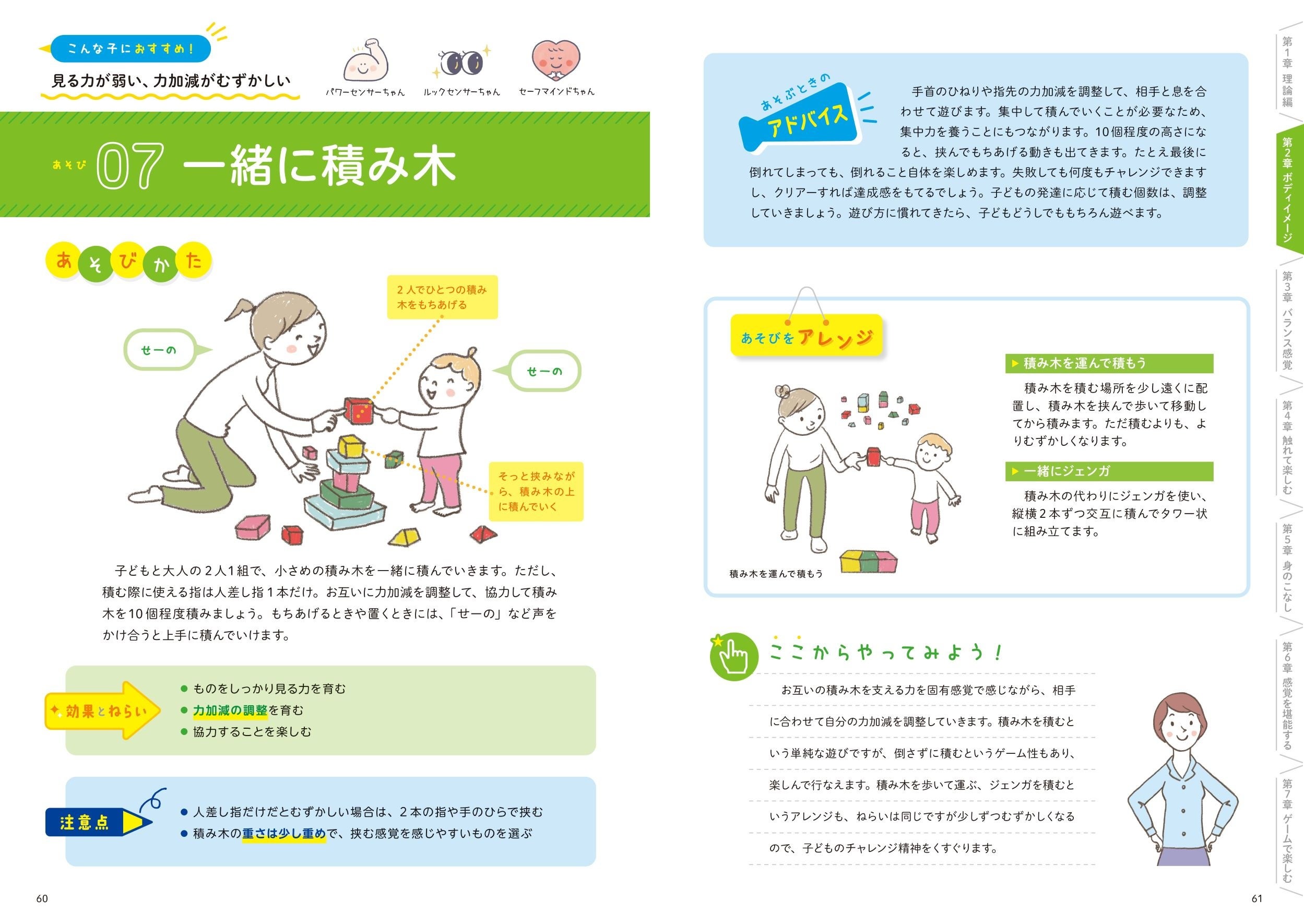 遊びごとにどのような子に適しているかを示し、伸ばしたい能力をアイコンで表示。効果とねらいを解説しています。楽しく実践するためのポイントや補足情報も掲載しています。