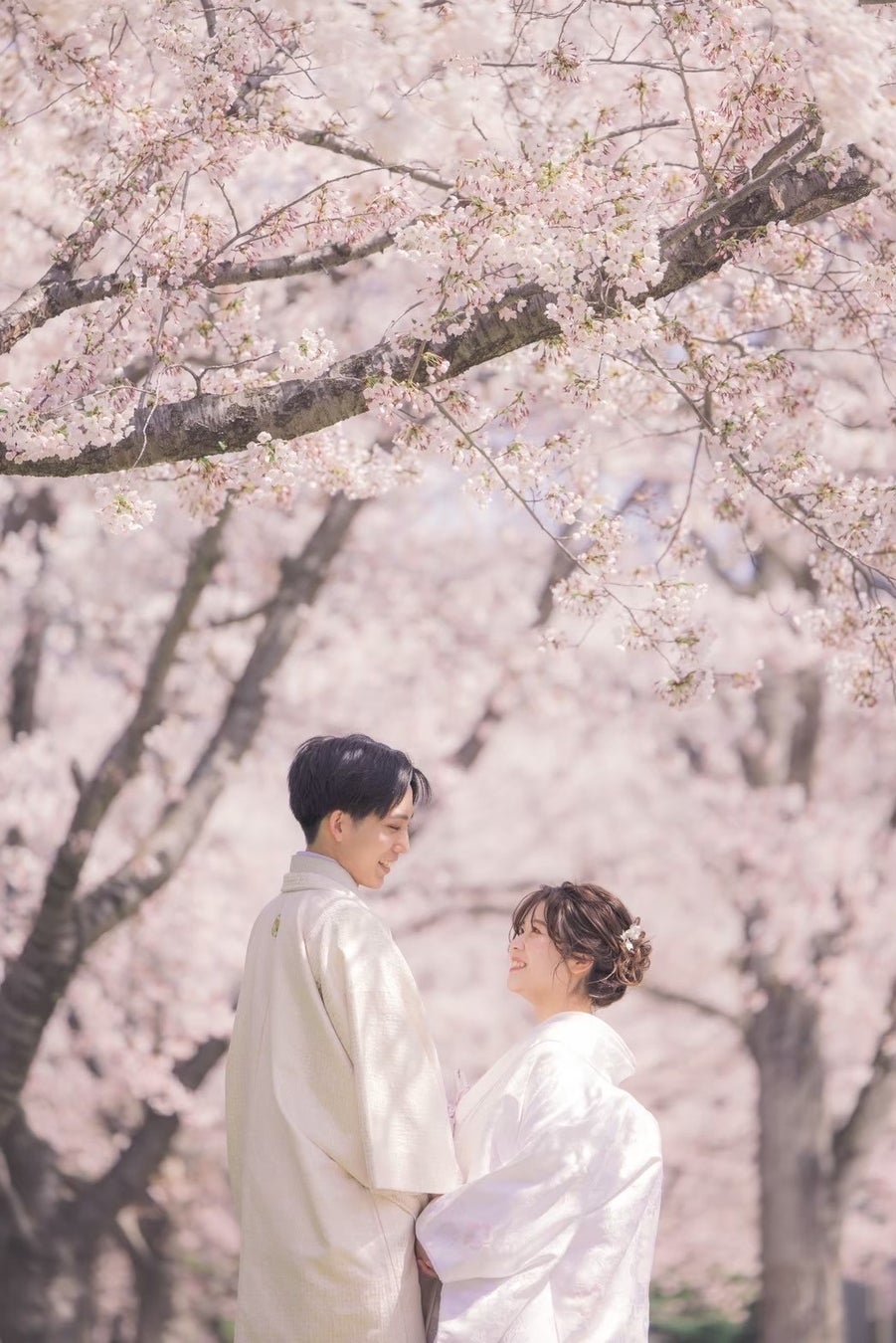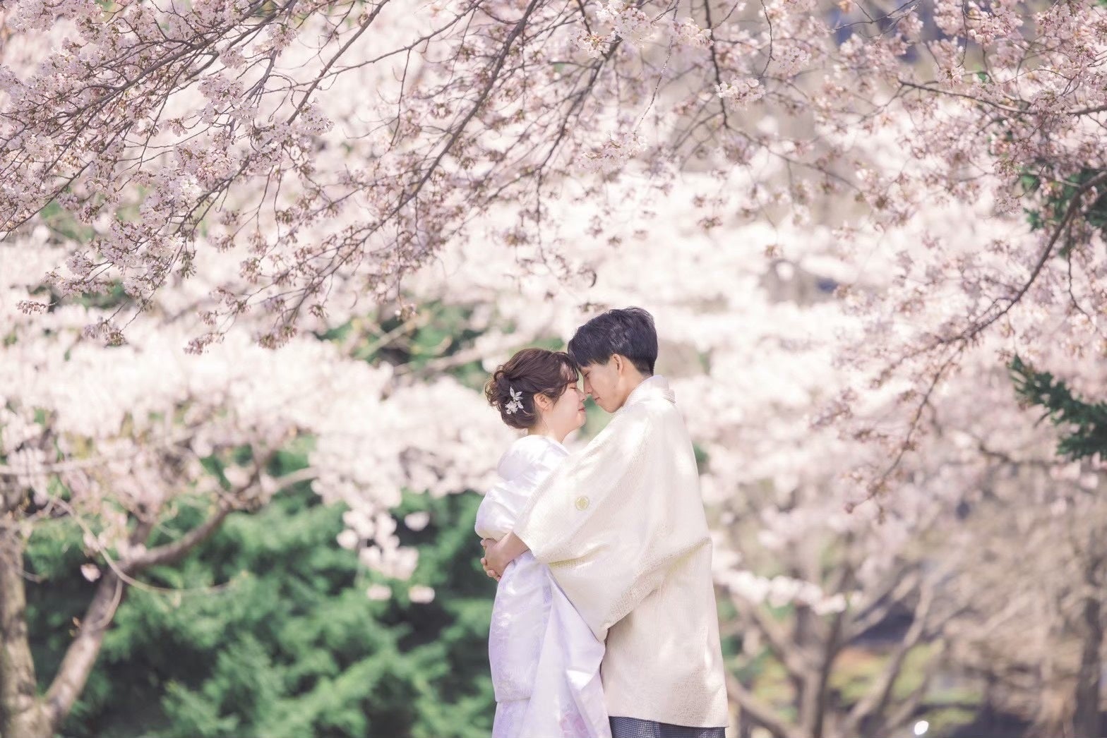 札幌市中央区にある「中島公園」では春になると公園に桜が咲き誇ります。和装で桜にかこまれたウェディングは毎年人気を集めております。当店では和装も衣装クラスフリーでお選びいただけます。