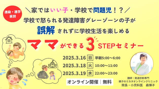 こうした課題を解決するために、小児科医であり、発達特性を持つ子の母でもある森博子医師が主催する『家ではいい子・学校では問題児!?学校で怒られる発達障害グレーゾーンの子が誤解されずに学校生活を楽しめるママができる3STEPセミナー』を開催します。