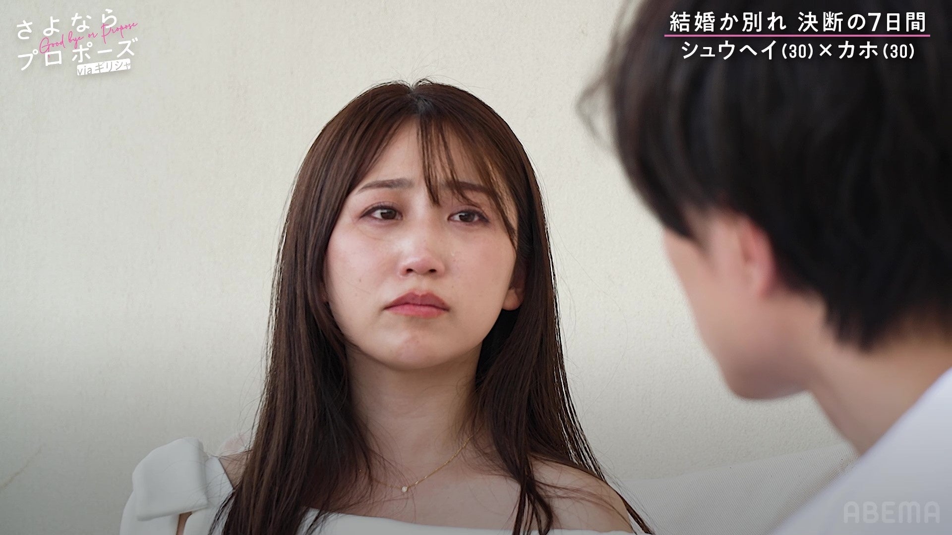 シュウヘイは「伝えておかなきゃ変わらないなって思うから」と口を開き、「俺が回りくどい言い方をしちゃうのって、小学校1年生でお父さんが亡くなったとき、現実を受け止めきれなくて1年ぐらい学校にも行ってなかった」「そのときに母親に向かってすごいひどいことを言っちゃった」「自分が感情的になるのってよくないな、人を傷つけるなって思ってそこから感情を抑えて当たり障りのない伝え方をしちゃったり」「そんな一面をカホちゃんに見せていないのに、自分が結婚していいのかな?って思うし、不安だった」と、正直に打ち明けました。このことを聞いたカホも「ごめんね、聞いてあげられなくて」と涙を流し、「それを乗り越えるにはどうしたらいいのかな?」「私はシュウヘイくんがどういう決断をしても受け入れる」と優しく伝えます。