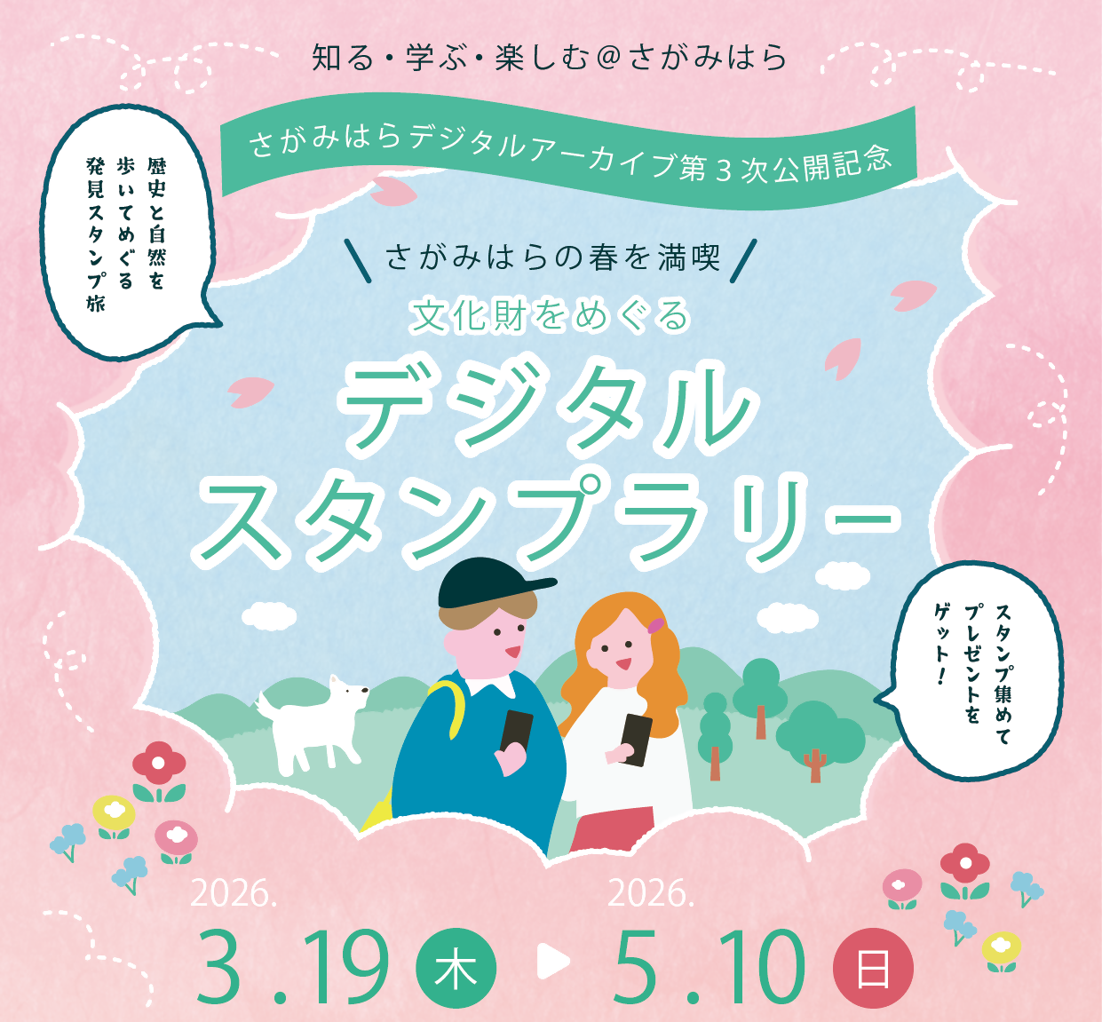 3次公開を記念し、デジタルマップを使って、文化財をめぐるデジタルスタンプラリーを開催中です。各コースでスタンプをすべて集めた人には、記念品をプレゼントします。(各コース先着200名)